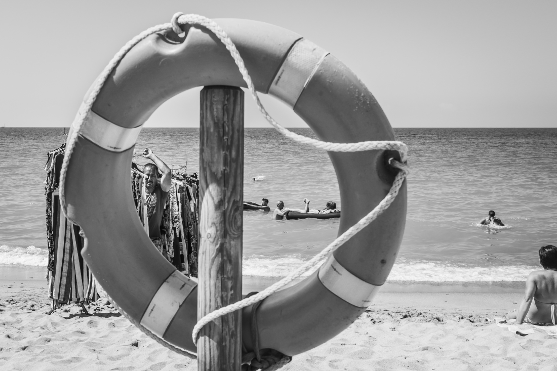 Un piccolo spaccato di vita balneare inquadrato dal cerchio del salvagente.Bello il bn,ottimo scatto.