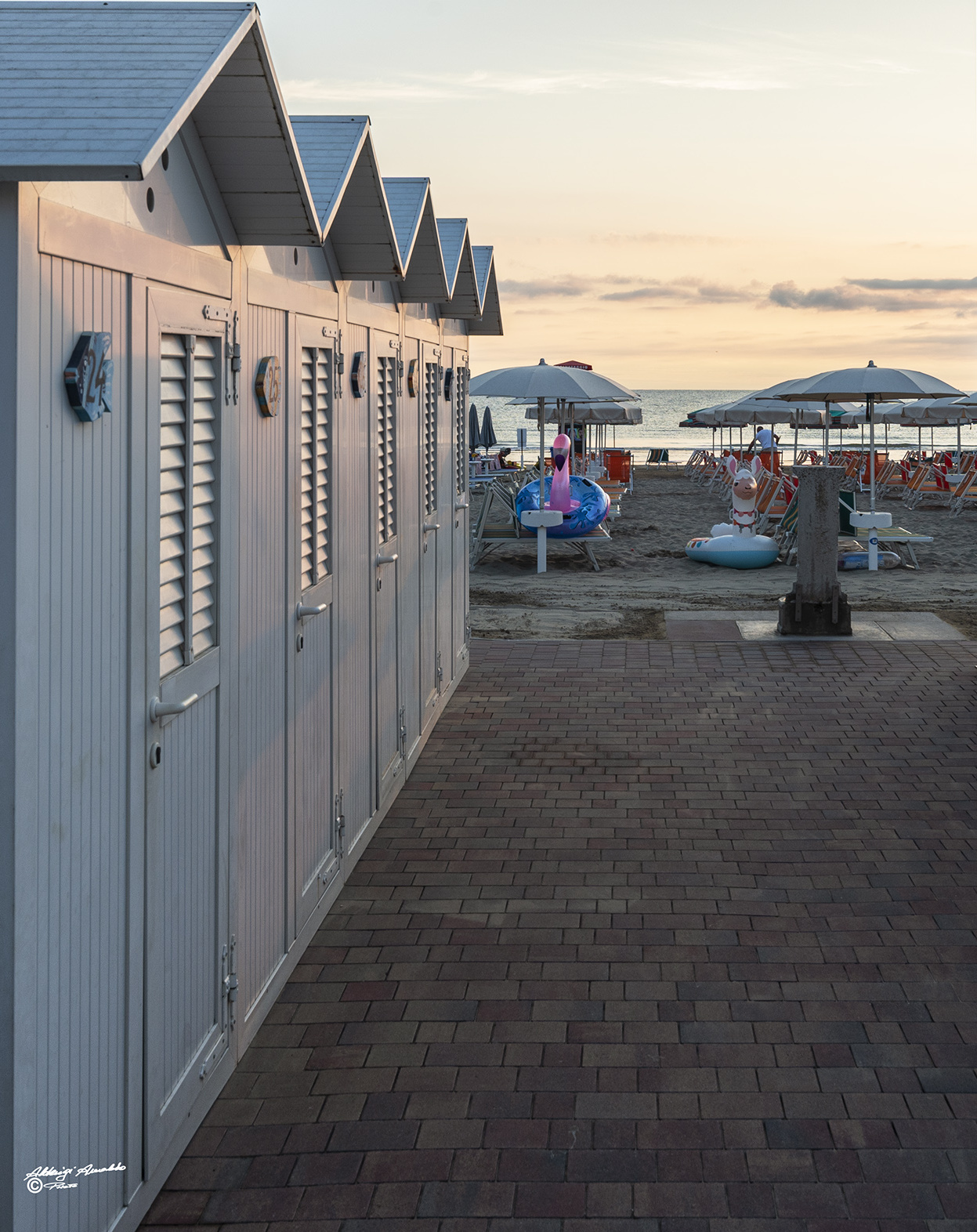 Bella luce, un po’ malinconica, da fine estate… Bella anche la prospettiva delle cabine.
