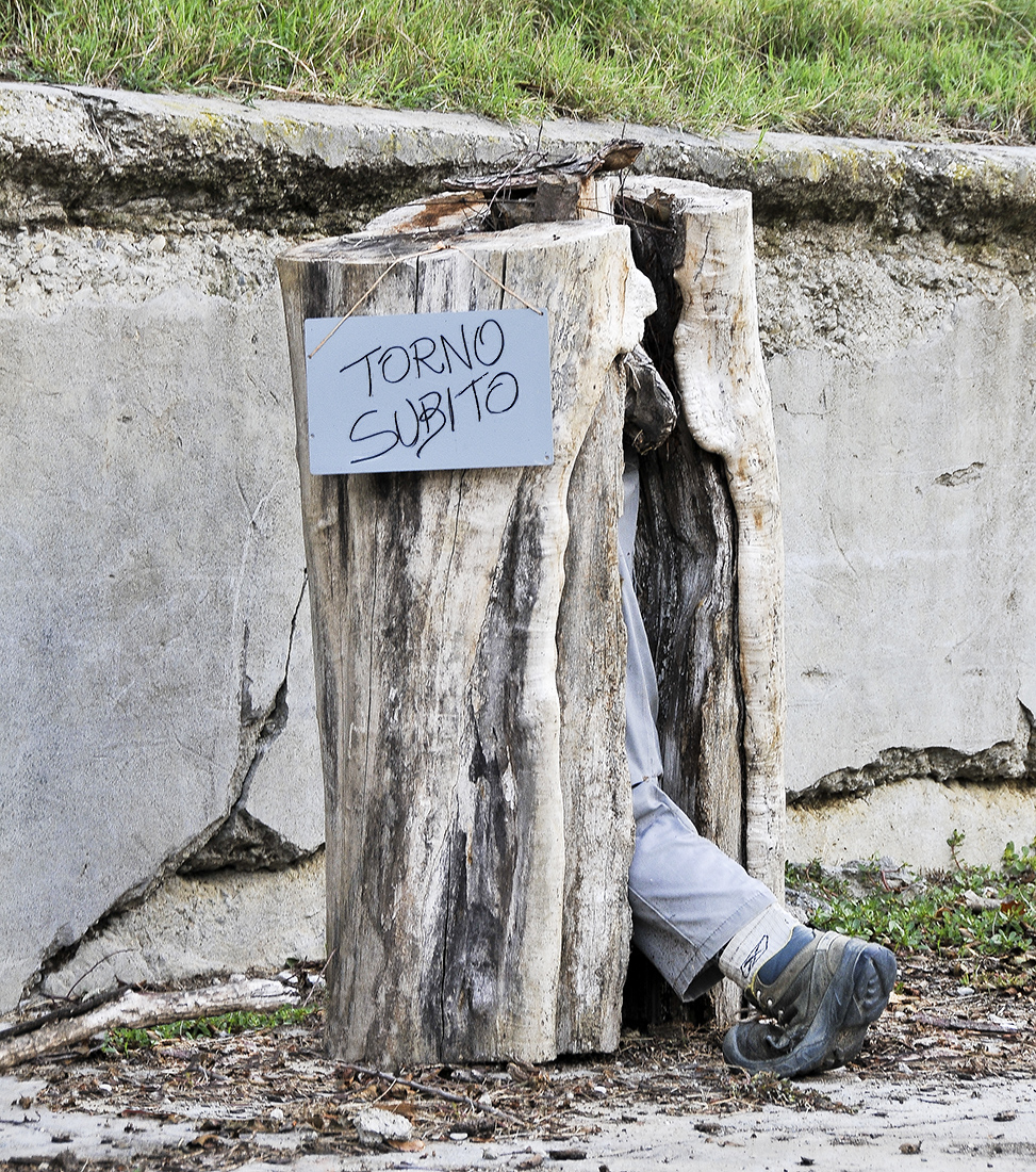 Curiosissima installazione che strappa più di un sorriso. L'illusione è forte e ci proietta simpaticamente in un mondo fantastico tra la tana del bianconiglio o un tronco 9 3/4 harrypotteriano. La nota tutta italiana del Torno Subito fa ancor più sorridere. Ben vista Ciao