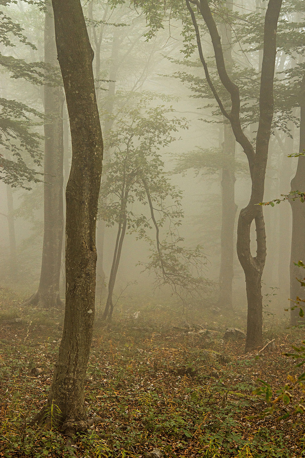 Piacevole atmosfera che regna tra la nebbia di questi alberi .
