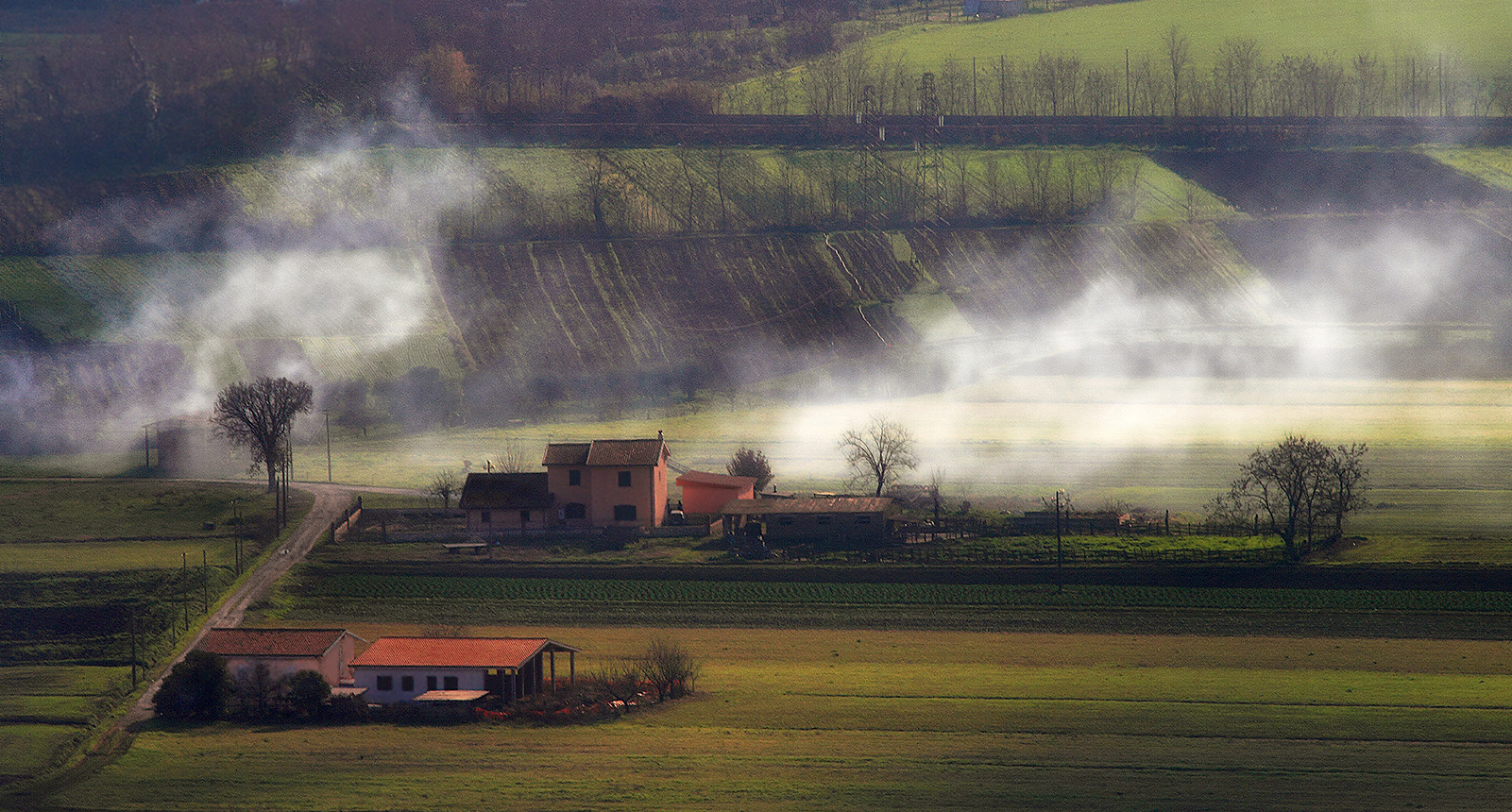 L' aeriforme bianco è il fumo dovuto ad un falò di foglie secche distante dai casolari. |