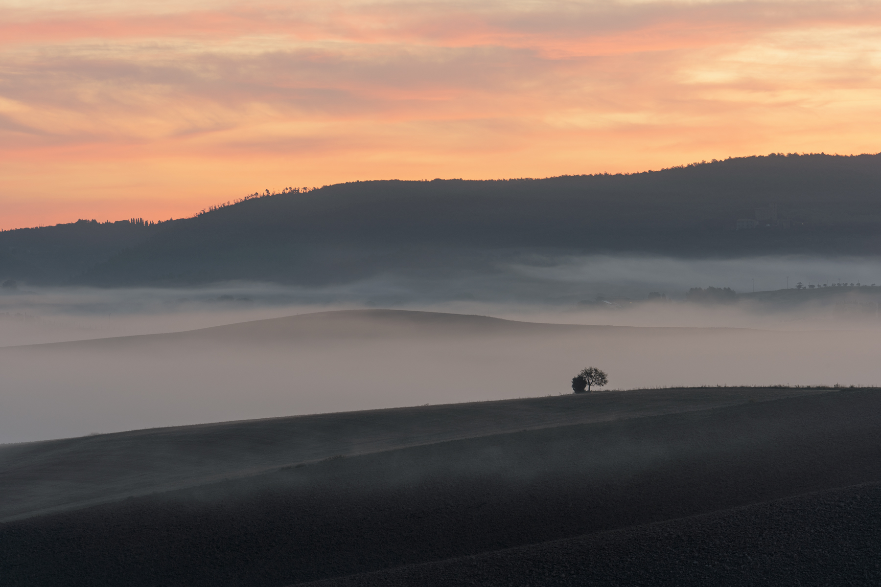 Un solitario che riesce ad emergere dalla foschia del fondo valle.. piacevoli tonalità del cielo. Ben vista.