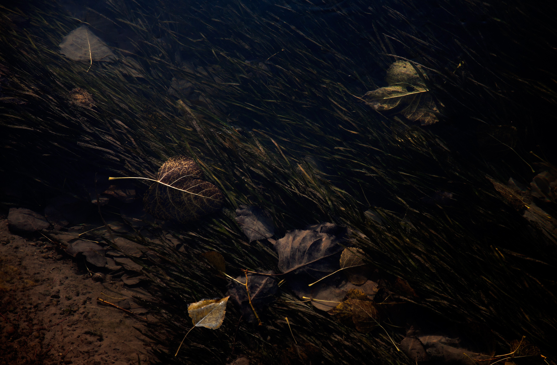 È la foto di un fossato dove solo parte della foglia gialla in basso a sx è sulla superficie, il resto è tutto sommerso ed avvolto dalle alghe del fondo