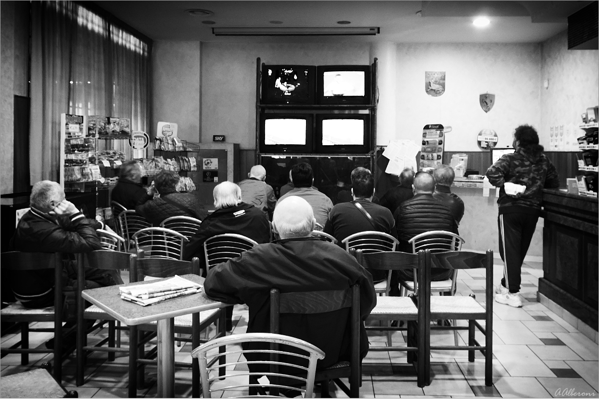 Se non fosse per i televisori potremmo trovarci in un bar di qualche tempo fa. A mio avviso buona la composizione e il bn (solo i biabchi sono sovraesposti).  _________________ Ciao