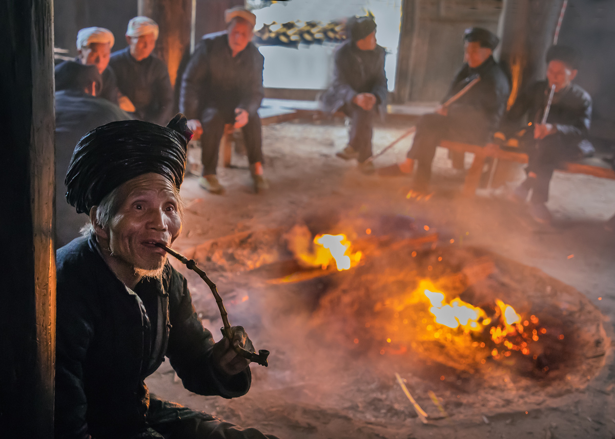 Guizhou, Cina. Nel piccolo villaggio di Yintan all'interno della torre del Tamburo, luogo di socializzazione