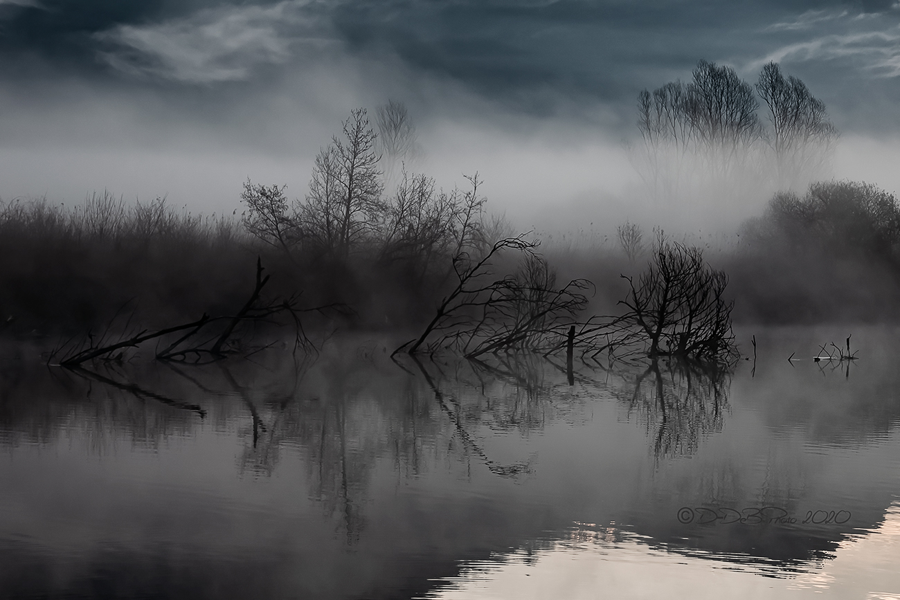 Che bella!!!Quando in una fiaba gli eroi devono sconfiggere il male attraversando luoghi misteriosi,freddi e magici..lo immagino più o meno così lo scenario.Quel velo di nebbia che cela la realtà alla vista,rami che spuntano dall'acqua come mani spettrali in cerca di un appiglio..acque immobili prive dei loro colori brillanti e tanto silenzio... Bella bella. Preferita Ciao