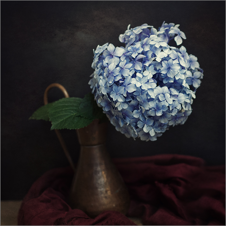 | Bellissima questa sfera di ortensia che esce dal buio con un effetto quasi tridimensionale. Il vaso pende un po' a sinistra ma forse lo volevi così! |