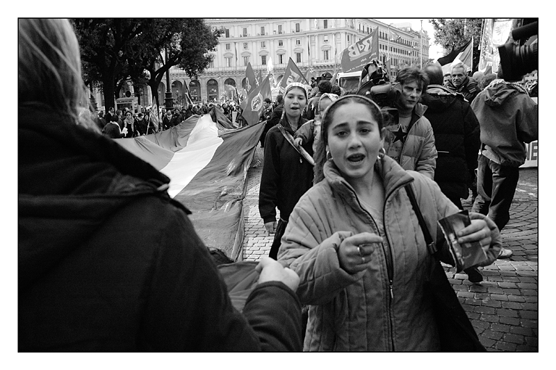 Un bel b/n, una delle tue belle foto di reportage: molto nitida, descrive benissimo l'atmosfera, la gente, la confusione, la manifestazione...