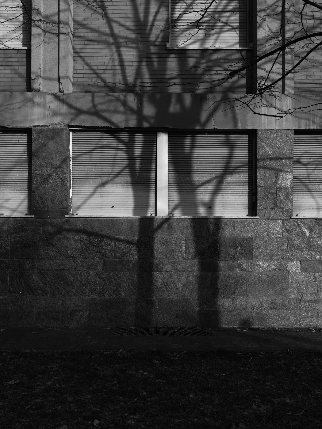 Mago delle ombre… Il dialogo tra gli alberi si scontra con la totale chiusura dell’edificio in un bn categorico.