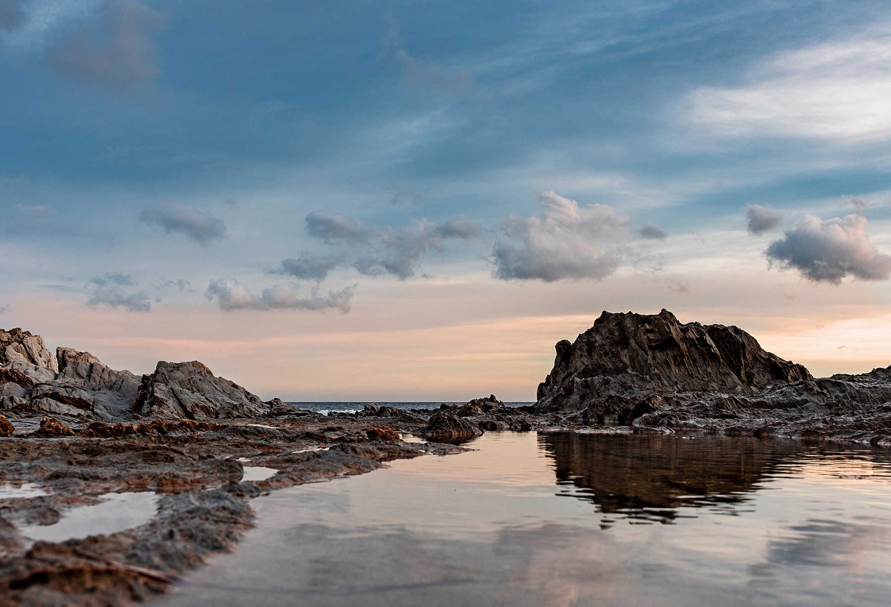 Ho abbassato il punto di ripresa al minimo, in pratica la macchina era poggiata per terra, il grandangolo fa il resto, deforma così tanto la prospettiva, da rendere una piccola pozza tra gli scogli un paesaggio a se.