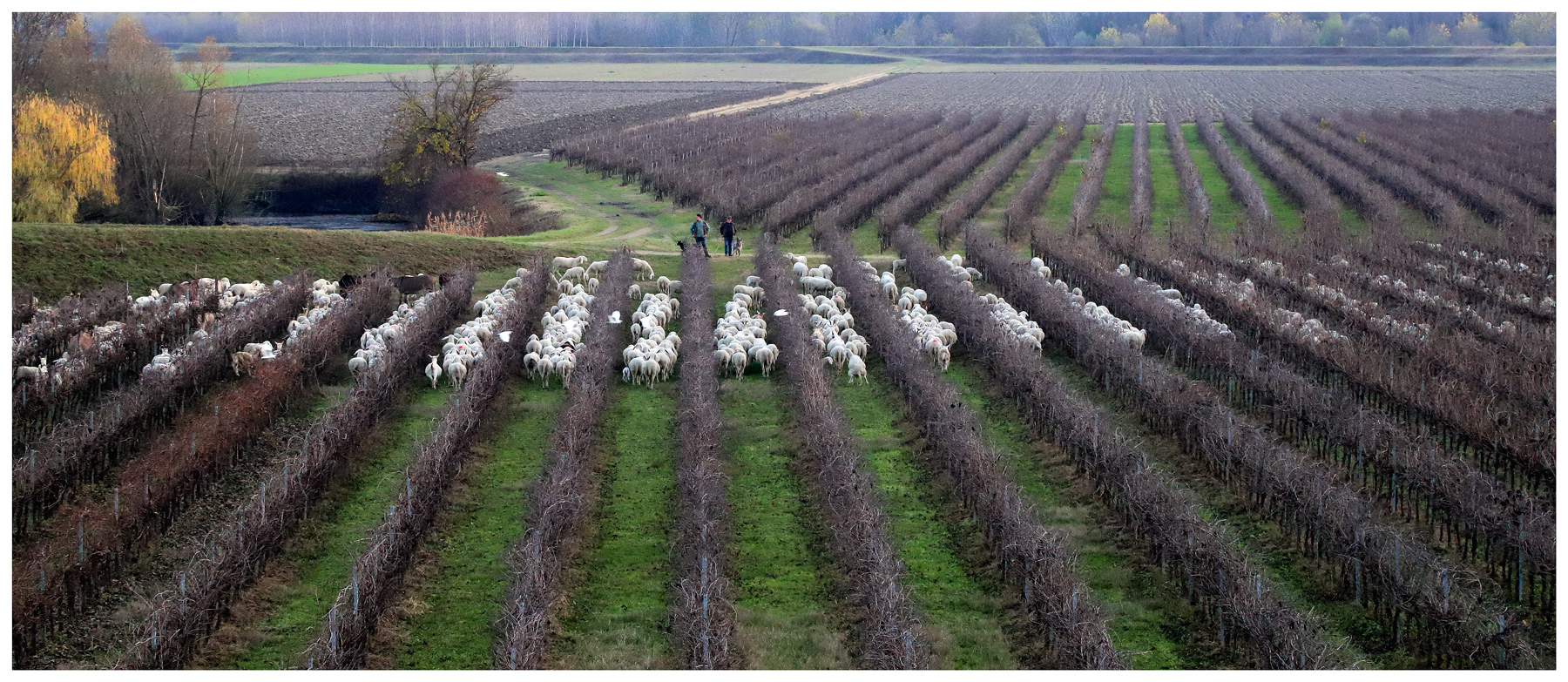 Fantastico questo raggruppamento di pecore tra i filari.Immagine originale e bellissima,ottimi i colori ed il taglio.
