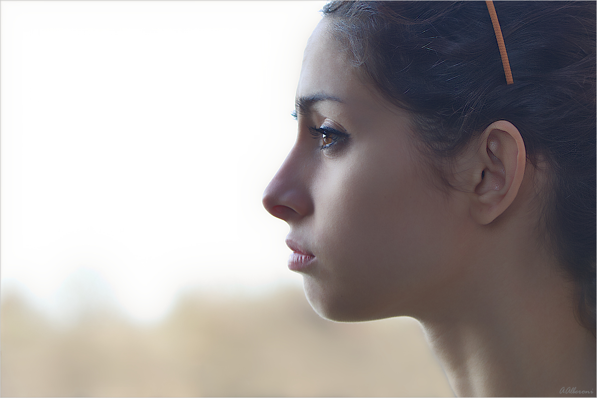 Quanto mi piace la su espressione..seria, malinconica ,intensa. Un profilo elegante in un bagno di luce che circonda il viaggio dei suoi pensieri di un 'atmosfera emozionante. avrei tolto il cerchietto forse, mentre non riesco a convincermi del tutto del taglio, non mi fa impazzire il senso di proporzione un po innaturale che da alla testa, ma magari è solo una mia percezione. In ogni cso un ritratto empatico e che colpisce. Ciao