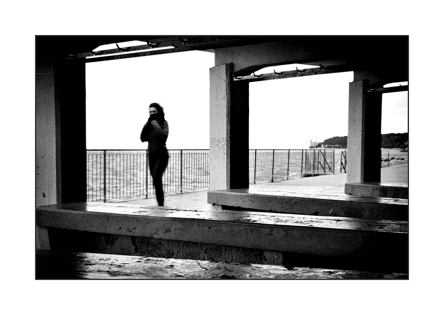 Bellissima composizione che rende benissimo l’incedere della ragazza con il vento contrario… Ottima la cornice alla scena data dalla struttura e perfetta la corrispondenza della ringhiera con l’orizzonte… Molto bravo!