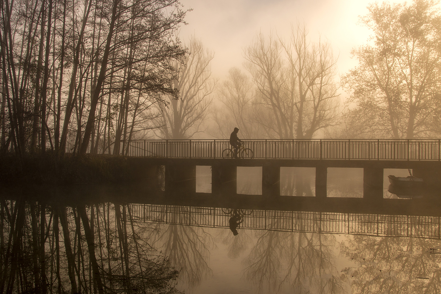 Ottima la presenza del ciclista con il suo riflesso, in una immagine molto bella, che raffigura benissimo l' atmosfera ovattata generata dalla nebbia. |