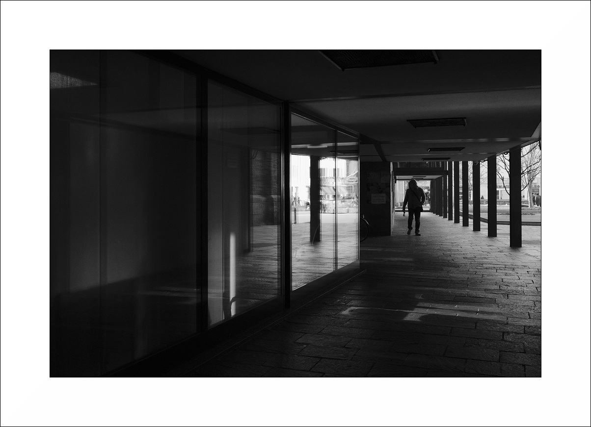 Immagine ottimamente composta, con geometrie e riflessi ben bilanciati in un ottimo bn… La figura dall’incedere malfermo la rende un po’ ambigua…