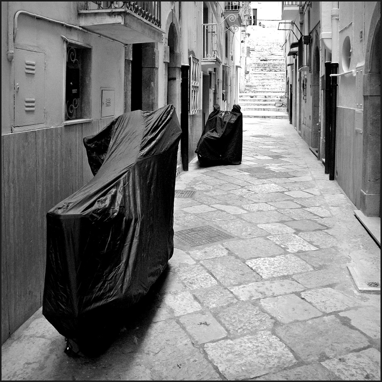 L’opposto dell’immagine precedente, che era allegra e colorata, questa esprime chiusura e attesa, anche l’atmosfera sembra sospesa… Buona la composizione, adeguato il bn.