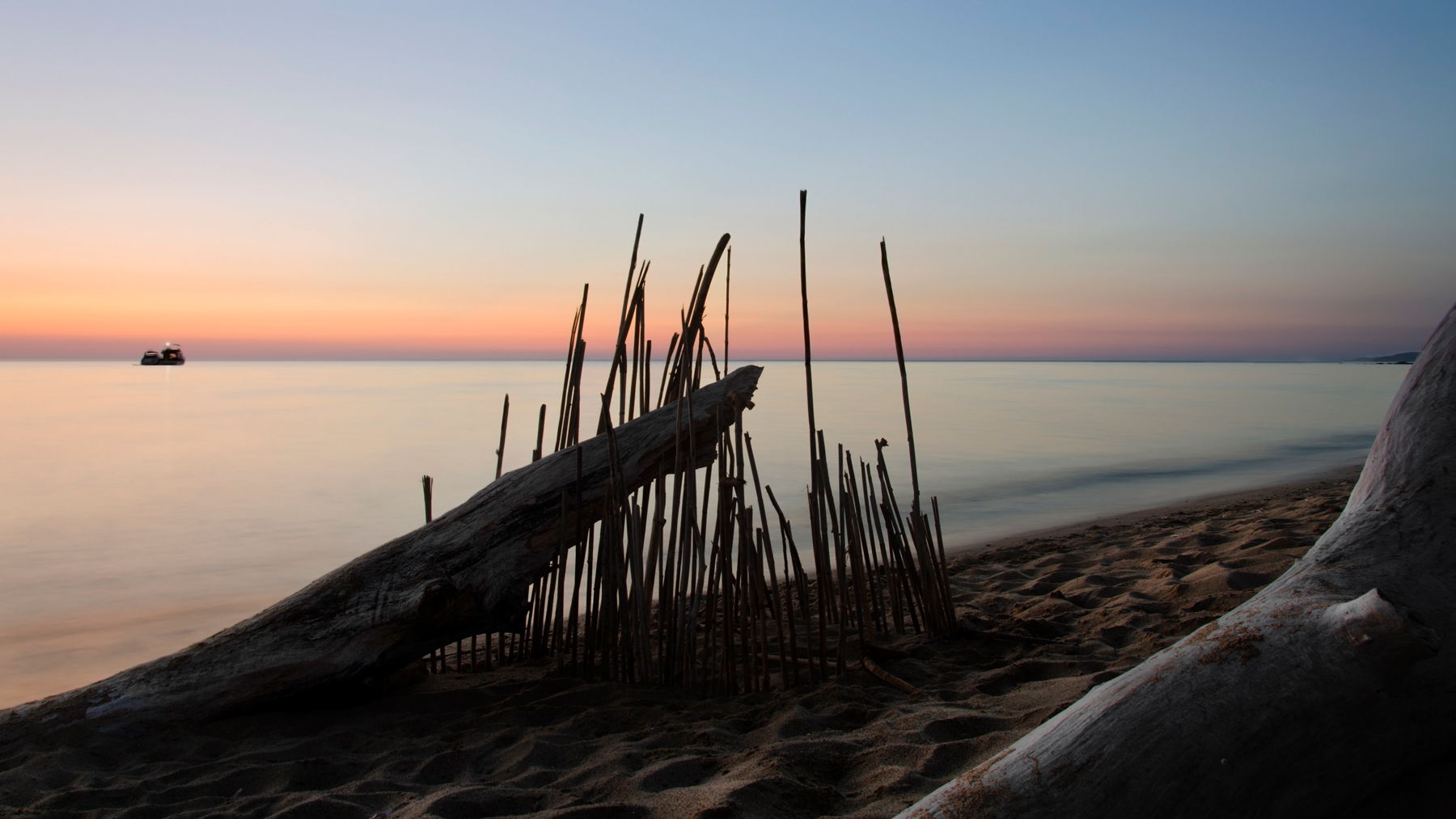 Ottima composizione con interessanti diagonali e punto di ripresa che evidenzia i notevoli tronchi relitti che contrastano con la levità dei cromatismi e le piccole barche unite,quasi a proteggersi dalla incombente notte.Bellissima immagine. Ciao,Sergio.