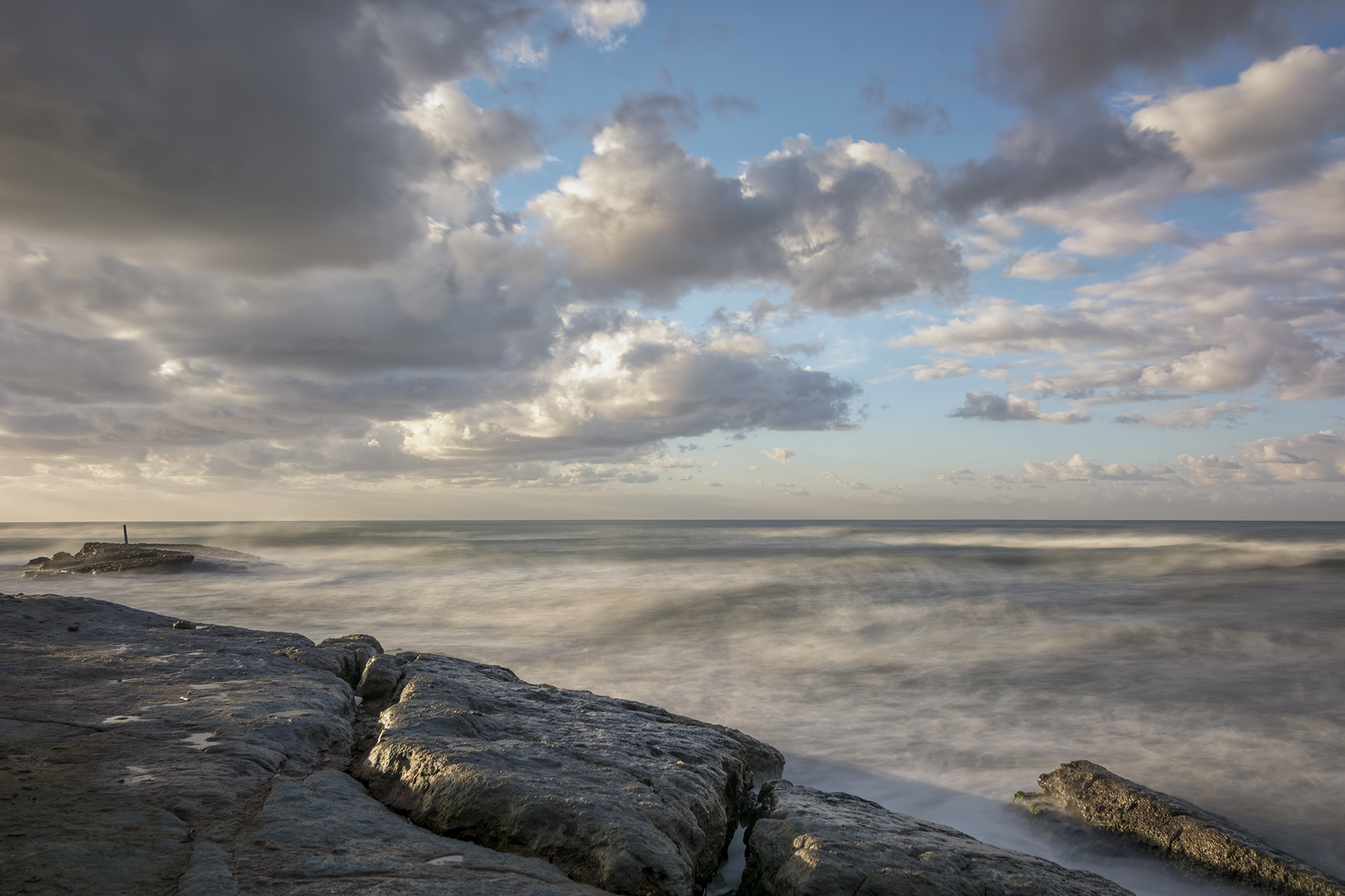 Bella bella Gio... Il respiro del mare restituito in maniera gentile,con le onde che diventano una soffice carezza sulle rocce lucide, una luce suggestiva e accogliente,un bel gioco di diagonali a disegnare il frame,tra nuvole e rocce che seguono un loro percorso lineare. Insomma una proposta molto piacevole. Ciao