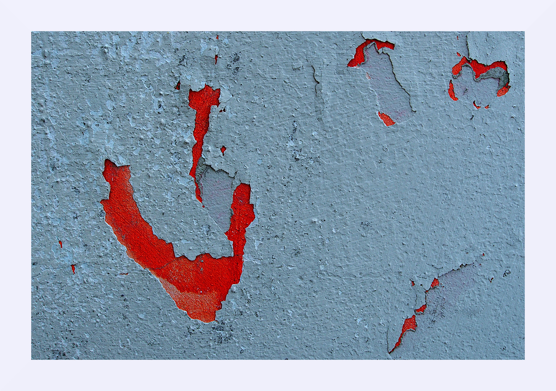 Mi piacciono le riprese ravvicinate di muri scrostati, restituiscono delle immagini astratte molto interessanti… Anche questa, con il deciso contrasto grigiazzurro-rosso, è davvero gradevole