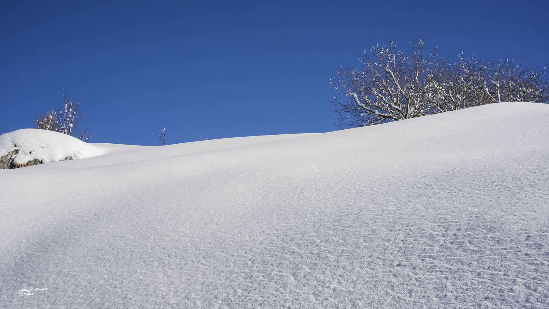 Molto bella… ottima la resa della neve e il contrasto con il cielo terso… Mi sarebbe piaciuta anche con un taglio che escludesse il cespuglio, e anche il rametto, di sinistra, per rendere più pura la composizione Smile