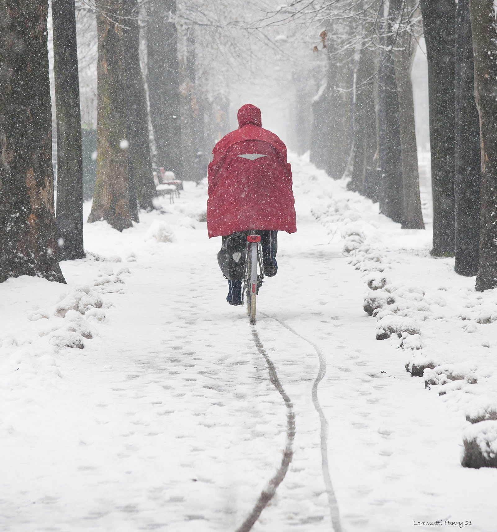 | Quando si ha passione per la bicicletta, la neve è un ostacolo che si supera facilmente. Ottimo il rosso sul manto nevoso in una bella ed eloquente immagine |