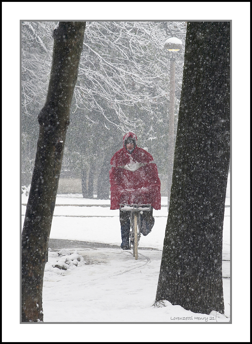 provvidenziale passaggio del ciclista con tanto di giacca rossa sotto una nevicata degna di nota e coraggioso e bravo tu!
