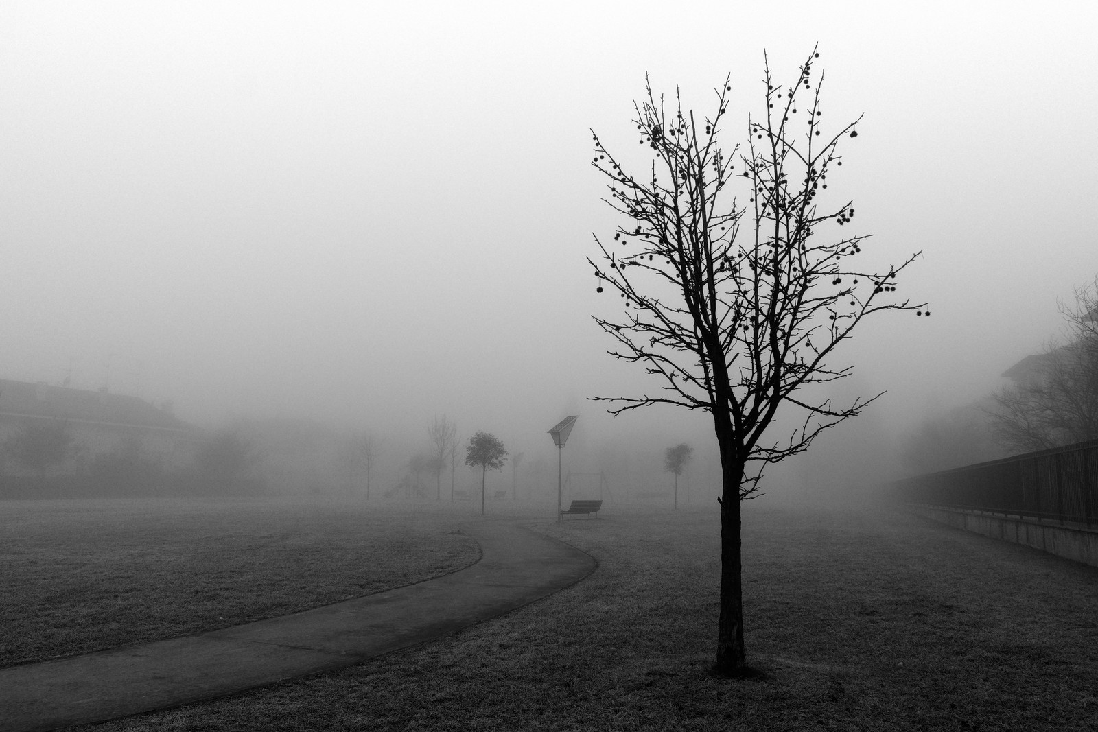 Immagine emblema di un inverno cupo e triste, con il doppio simbolismo di una vuotezza nebulosa e di un albero (ha ragione Giuseppe) che sembra offrire i frutti del covid… Molto bella, significativa.