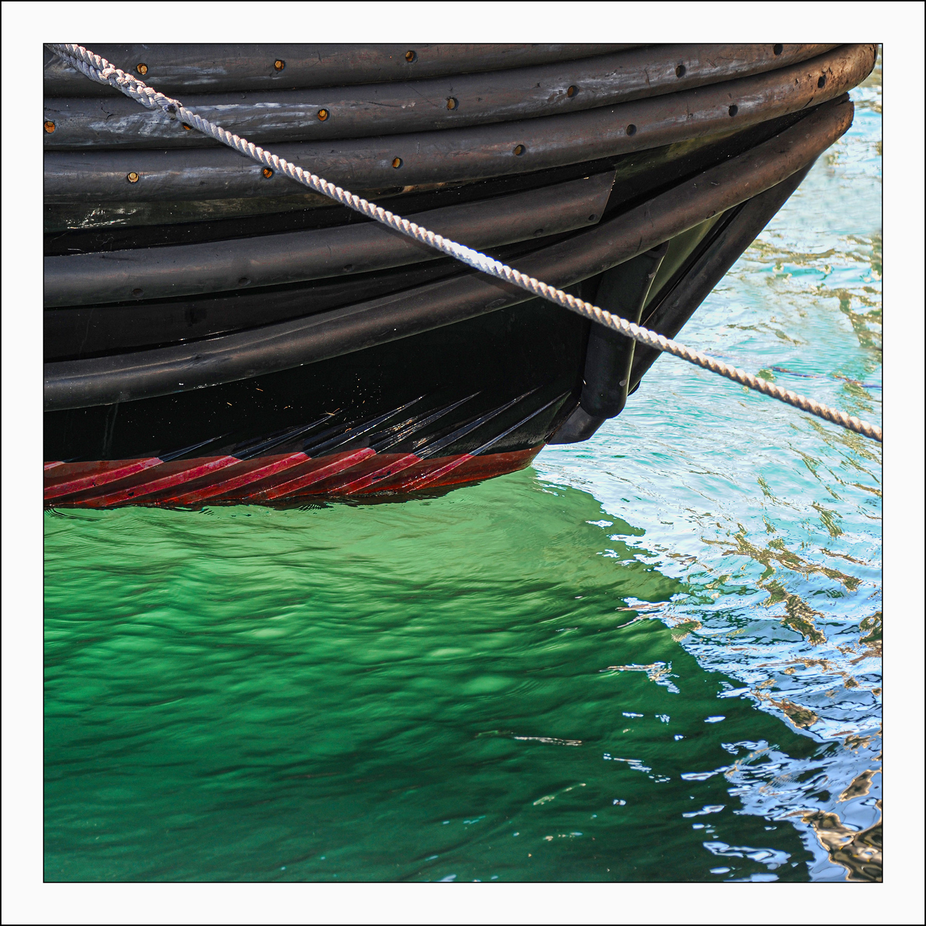 Scafo nero e acqua smeraldo sono in antitesi, componendo ho cercato di bilanciare i due estremi creando nello stesso tempo una zona ''neutra'' (il triangolo a destra) che legasse quelle due masse diverse ma equivalenti.