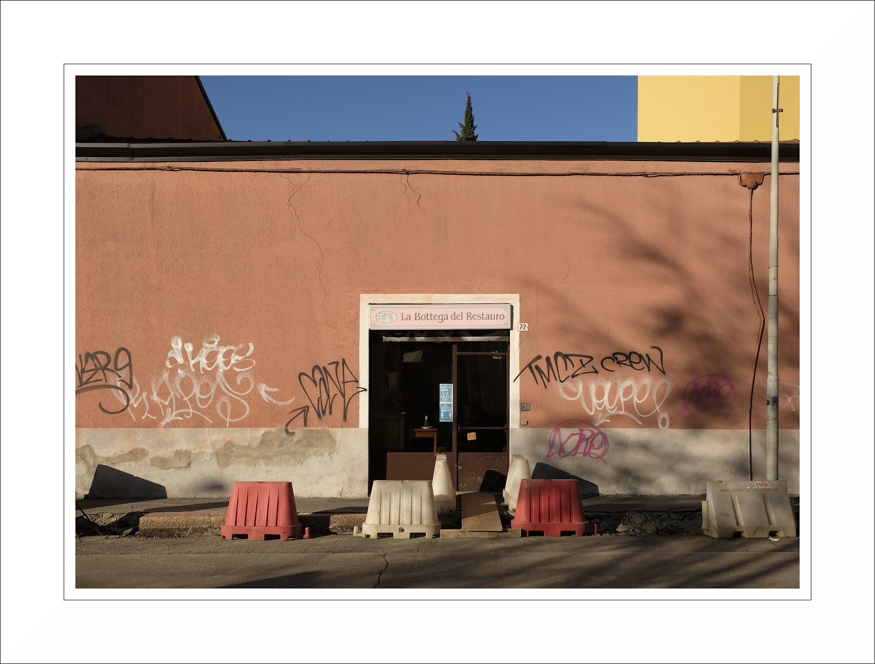Lasciarsi prendere la mano impedendo l' accesso al negozio del restauro, ed imbrattare il muro con scritte...ma mi sfugge qualcosa (ovviamente sono io a non “vederla”) . Non lettura a parte, la foto è molto bella e ben realizzata