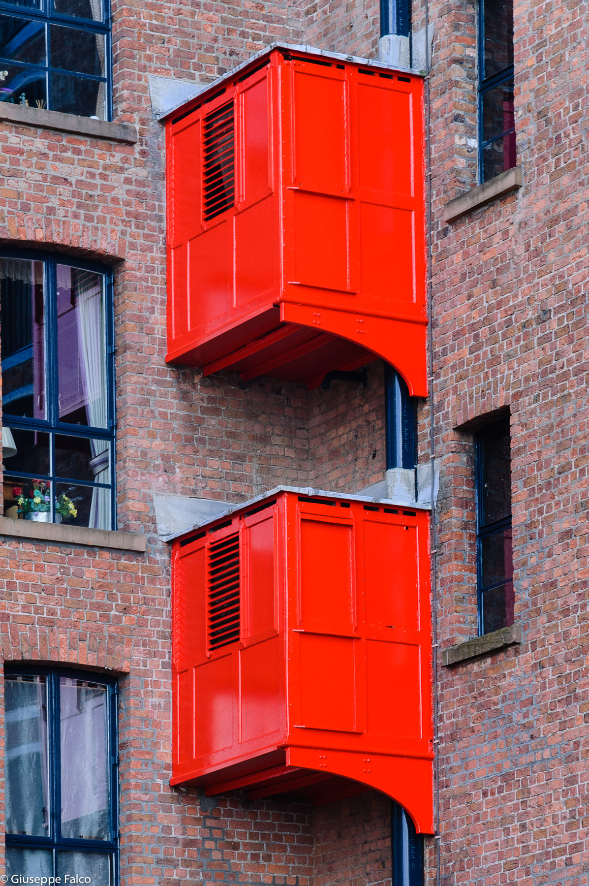 Il complesso è ancora quello dei dock ristrutturati di Liverpool, composto da vari edifici uguali. Queste cabine si trovano su fronte strada dove la facciata non è lineare come sul lato del porto, ma a forma di U con l'ingresso nella parte più interna. Le cabine non sono presenti in tutti gli edifici, ma il tubo nero si.