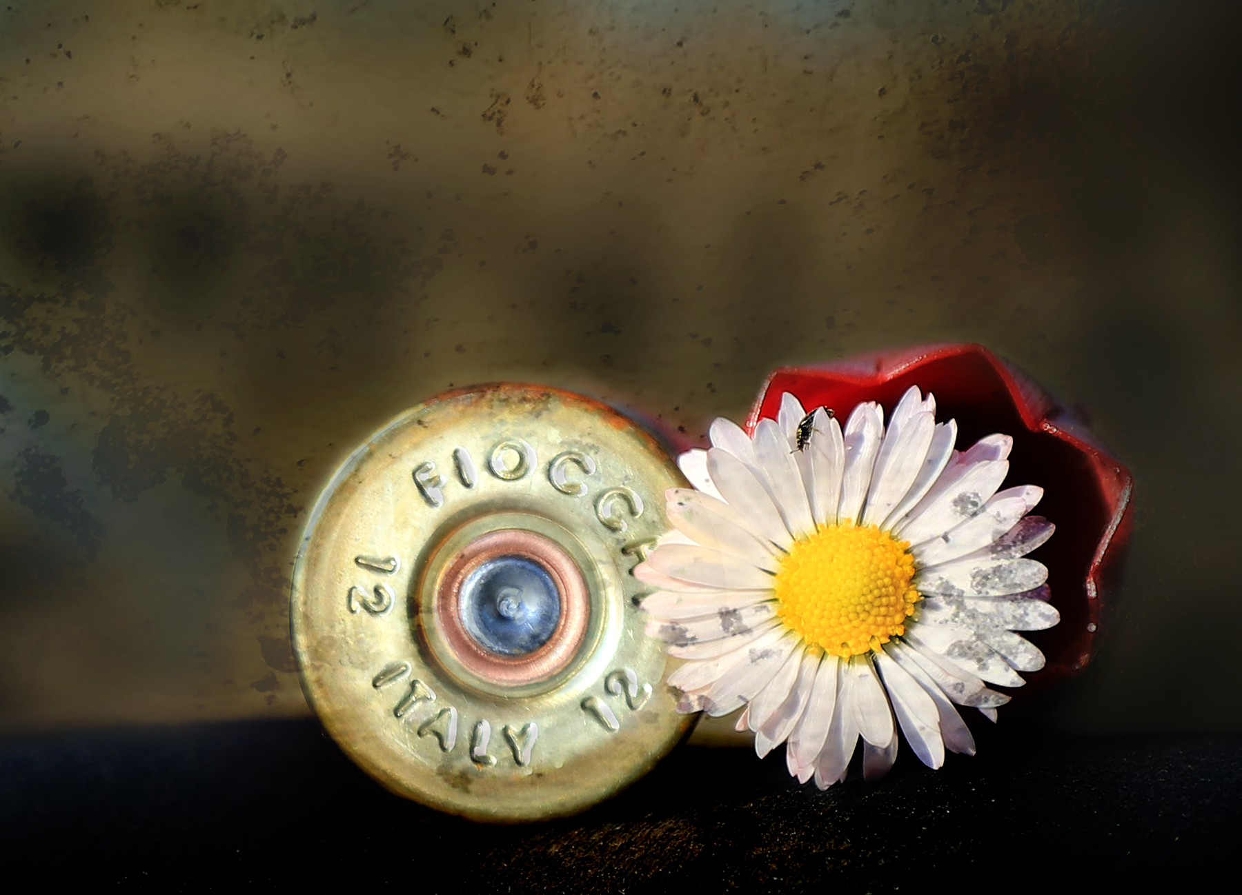 Un'immagine intrigante e alternatva a quelle anni 60 contro la guerra in cui pacifici figli dei fiori infilavano margherite nelle canne dei fucili.