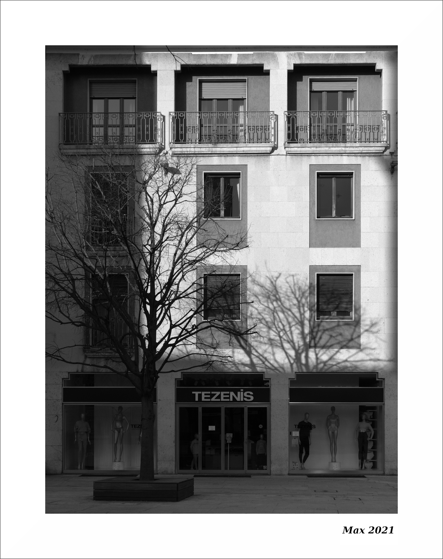 Un albero spoglio che proietta la sua ombra sulla costruzione con finestre e negozi senza figure umane ....una realtà attuale. Una foto accurata nella composizione con un ottimo bn