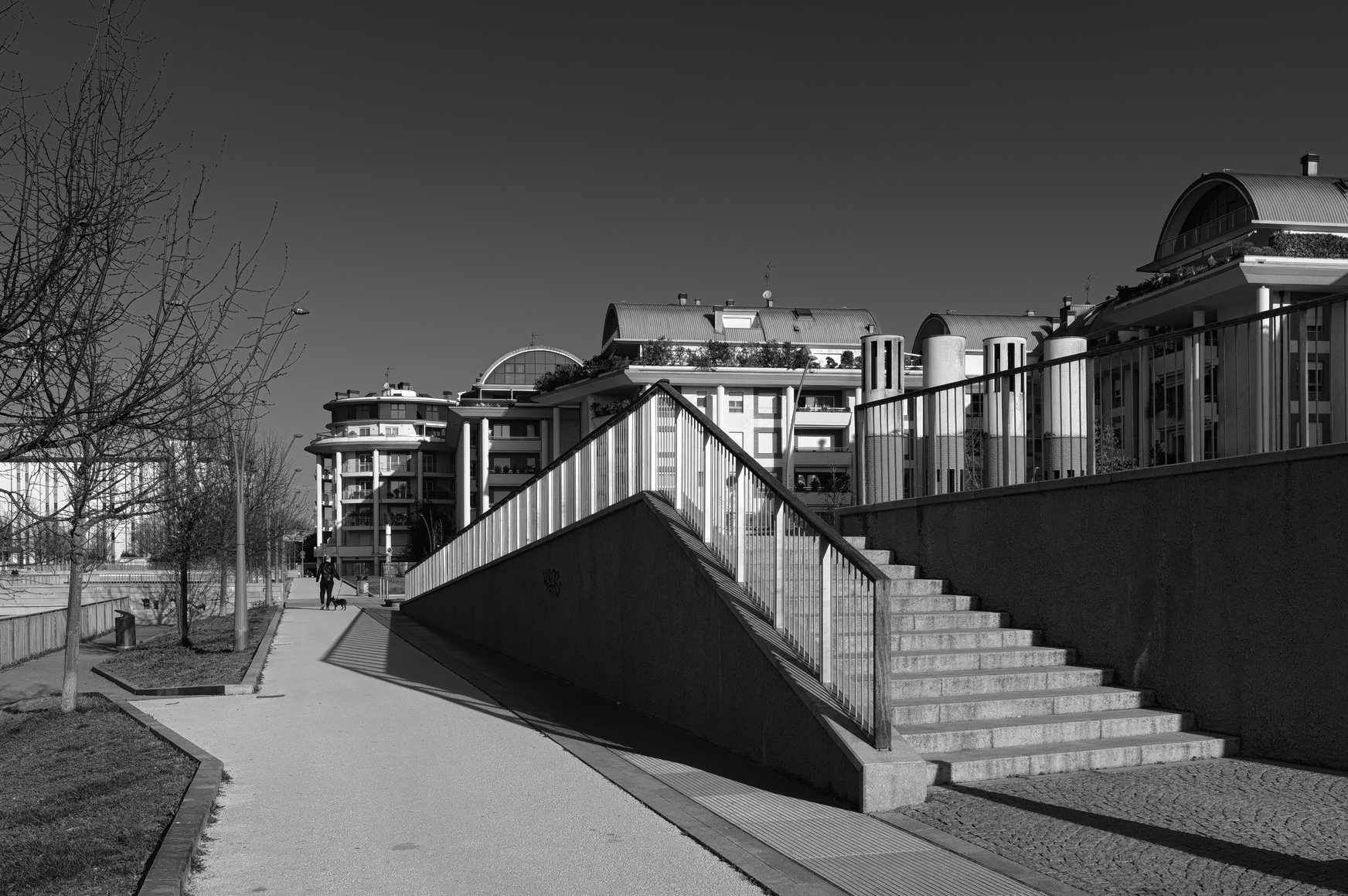| Un bianco e nero con una bella gamma tonale che valorizza le forme della struttura ripresa. Curata la composizione ,come interessante la posizione del passante nel frame.Un saluto, guido |