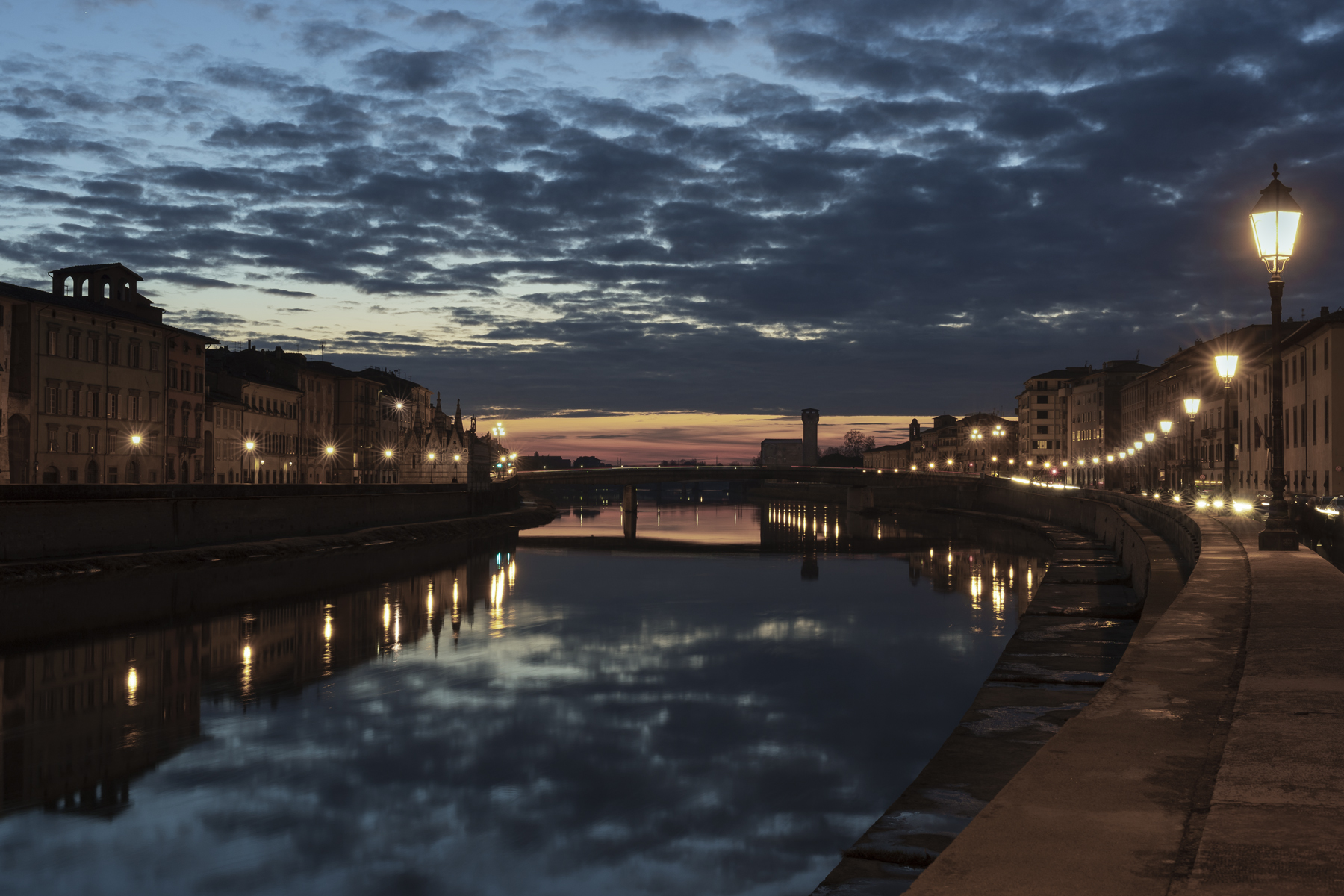 Bellissimi colori in questo quasi notturno… Ok! Mi piace molto la tonalità rosata del tramonto, molto simile a quella, anche se più scura, dei palazzi del lungarno… Bellissimo anche il cielo che si riflette nell’acqua del fiume, in una composizione equilibrata e avvincente. Bravo!