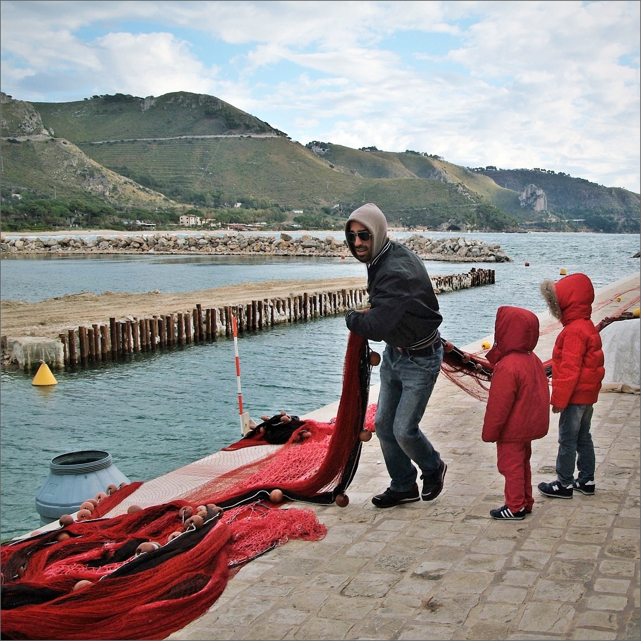 Molto piacevole questa immagine, con i due bambini ben coperti.. mentre osservano il lavoro del padre nel recupero delle reti.. facendo vedere quanto sacrificio ci vuole nella pesca.. Ottima proposta.