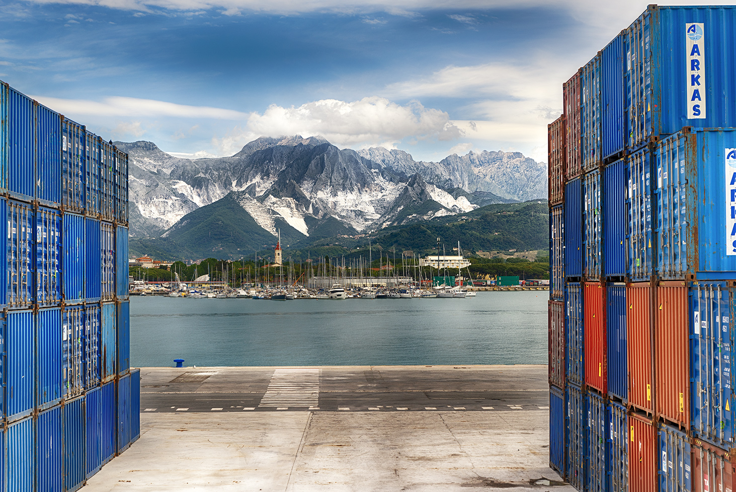 mi piace questo sipario di container che si apre per farci godere di questo bel paesaggio mar-montano o marmo-montano