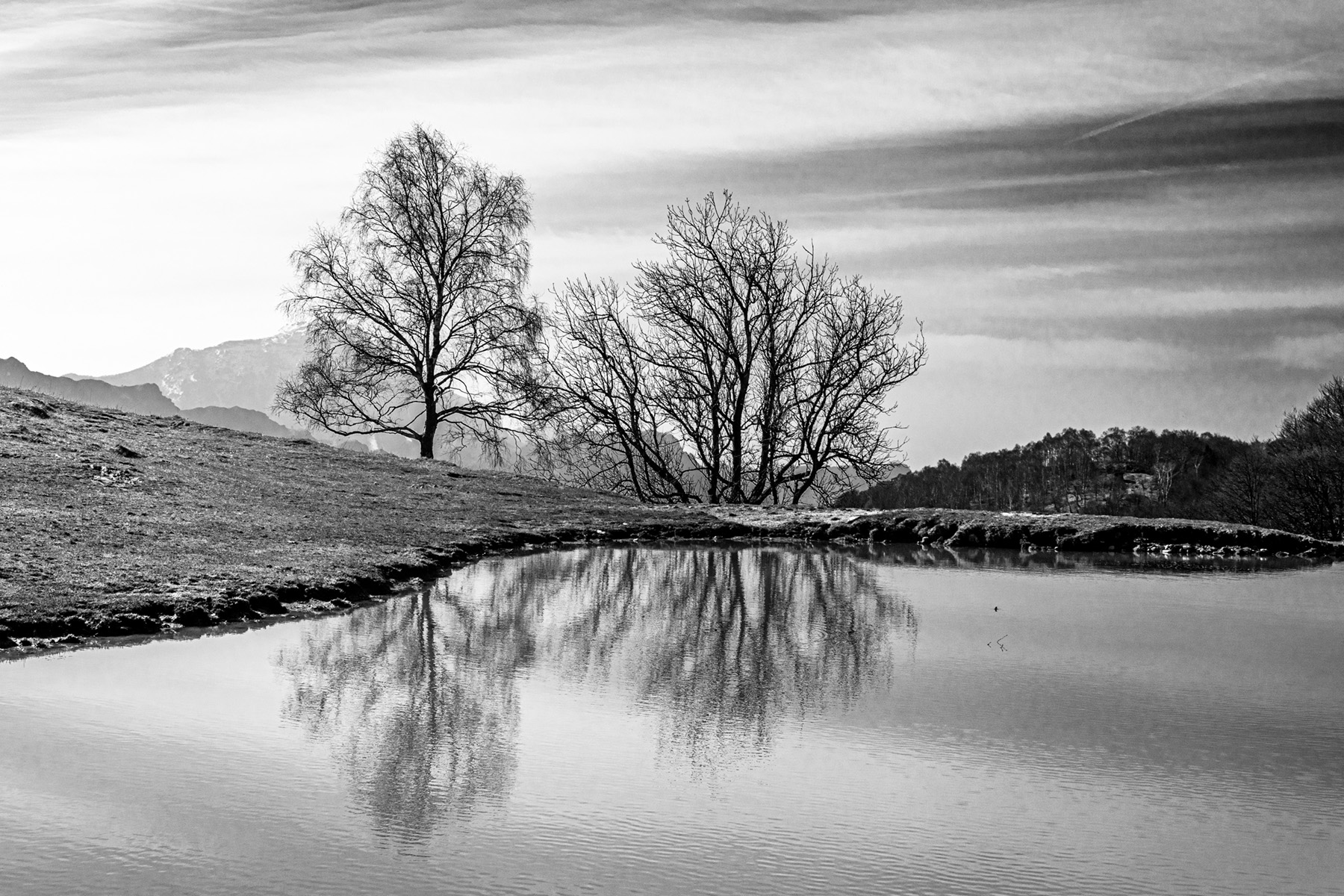 Bel b/n che fa risaltare gli alberi e il riflesso.