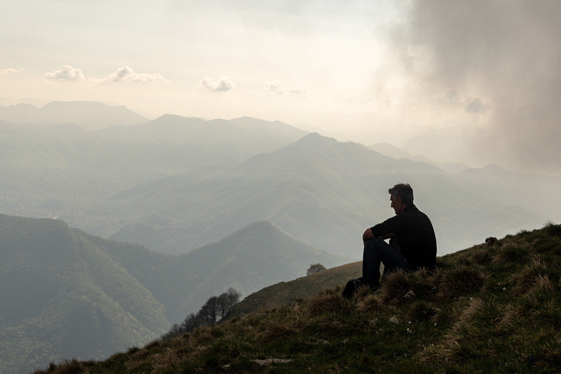 Un momento di contemplazione, l'uomo la montagna. Solo ad ammirare la bellezza di queste vette che sfumano dolcemente nella foschia. La luce morbida è ricorrente nelle tue proposte ed ormai sai domarla a piacere.
