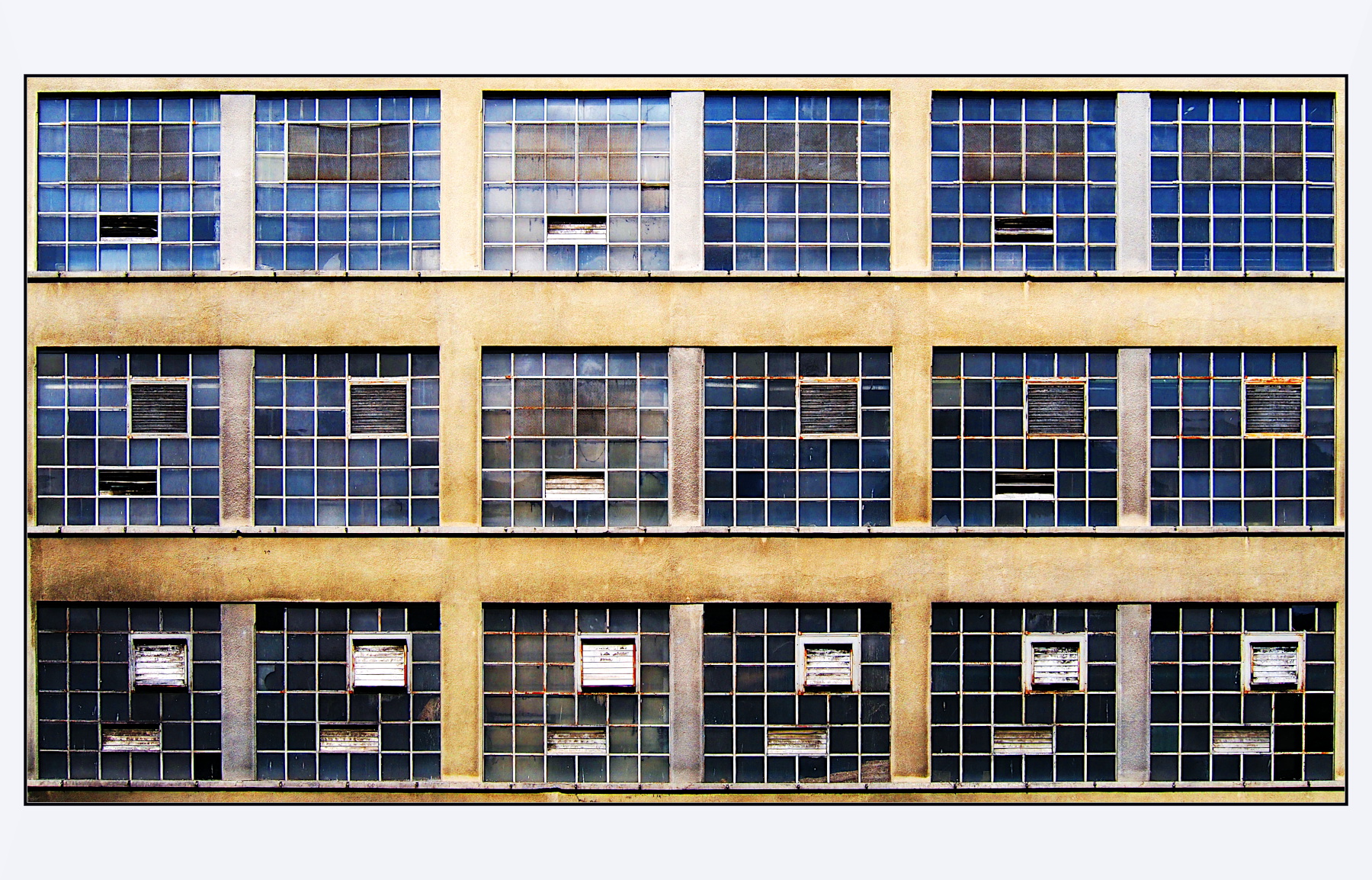 | Adoro le costruzioni abbandonate di ogni tipo ma in particolare anche i vecchi capannoni industriali, sicchè questa foto me la sto gustando proprio con piacere. Variazioni di colore, di sbiadimento, di opacizzazione dei materiali delle superfici, innumerevoli quadrati nei quadrati, tessere infinite di un mosaico che si compendia anche di ruggine e areatori più o meno danneggiati dal tempo e dall'incuria. Un vero e proprio monumento all'usura. Perfetta foto in stile Urbex. Sicuramente una che rientra nelle mie Preferite. Ciao, Tiziano |