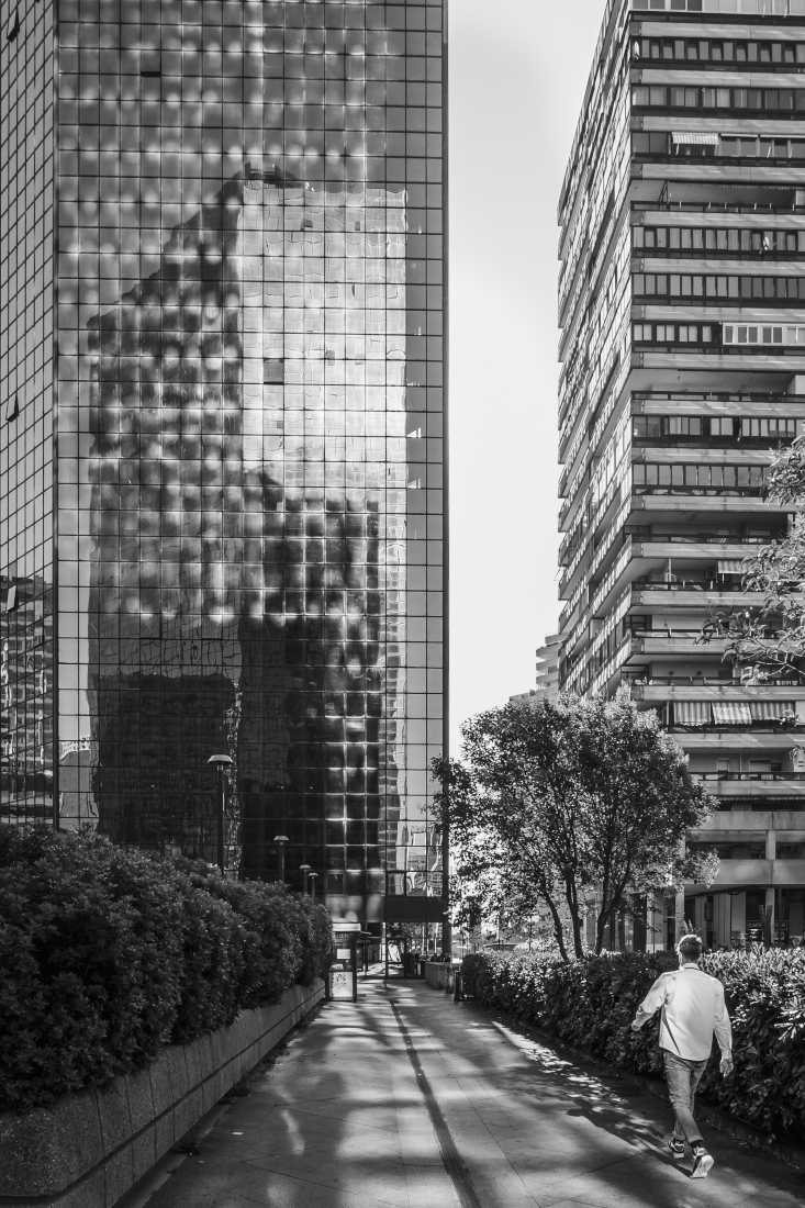 Fantastico il palazzo che si riflette nell'altro, molto ben realizzata anche la conversione in BN. Avrei aspettato un secondo per piazzare il passante leggermente più avanti...