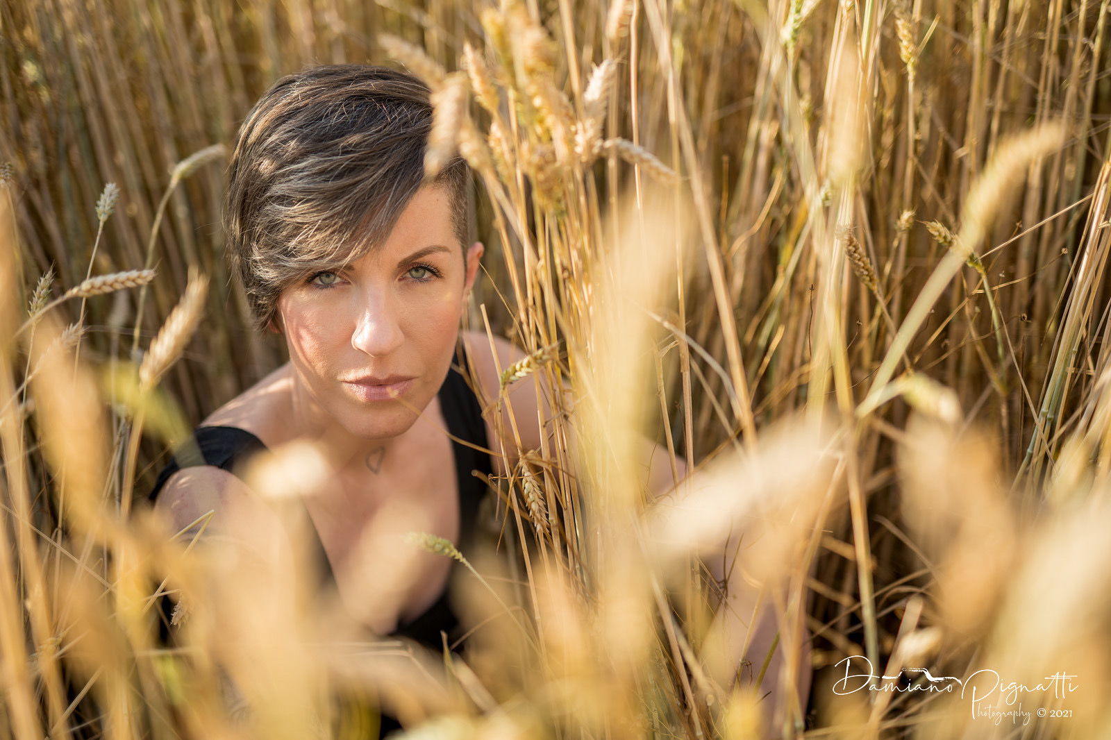 Molto bello questo ritratto tra le dorate spighe di grano.