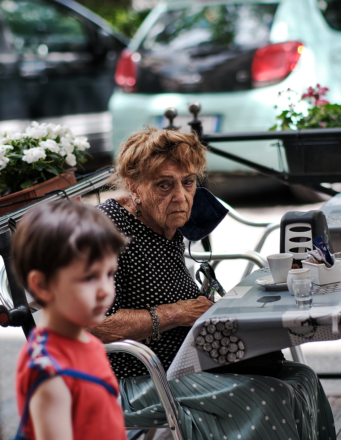 Scatto rubato ieri a Torino, ero al bar ad ordinare il caffè e la signora aveva subito attirato la mia attenzione, nel mentre che preparo lo scatto passa da sinistra sto bimbo che attira lo sguardo dell'anziano soggetto.