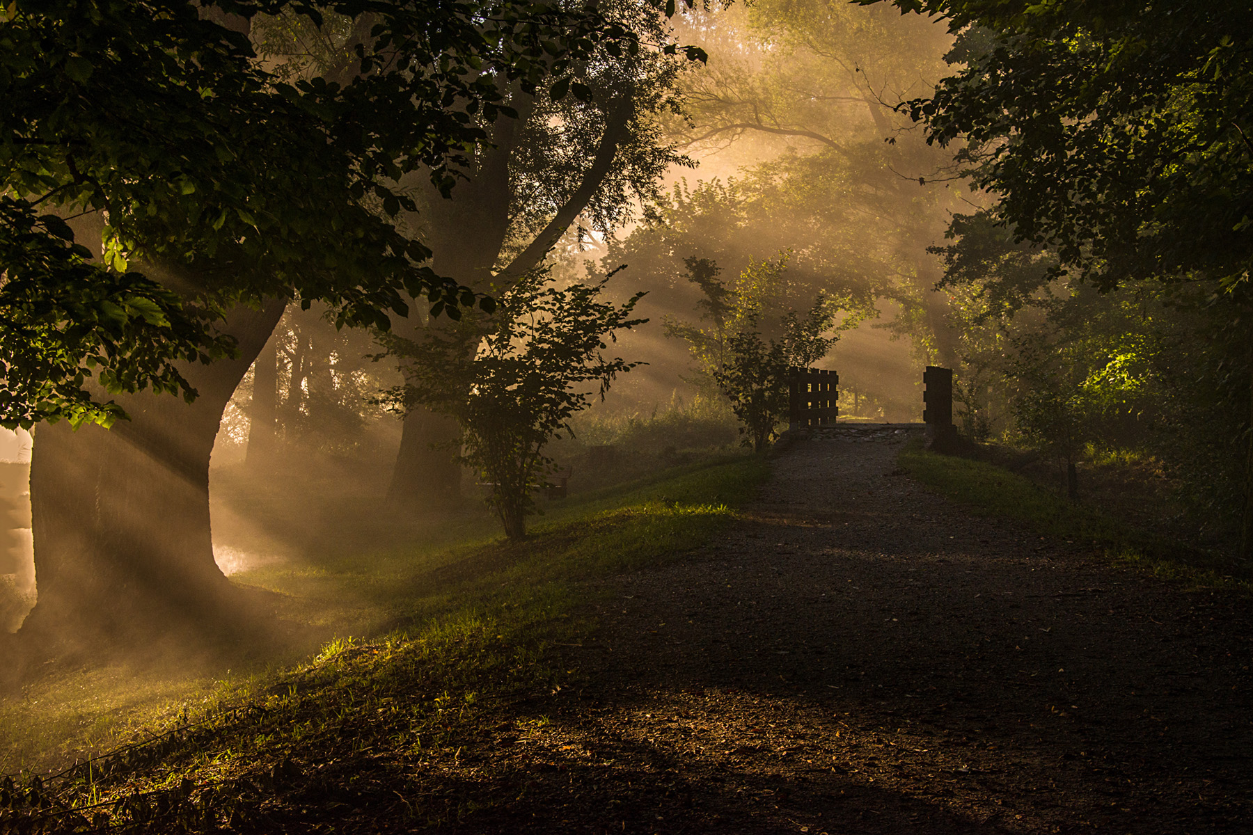 Il sentiero accarezzato da tratti di luce, i raggi di sole che filtrano tra gli alberi e rivelano l'oro che vi sta oltre, la leggera china verso il pontile posizionato dove il cammino segue lo sguardo, il varco che si apre in fondo sotto archi di rami a volta avvolto in una candida luce dai dolci colori.