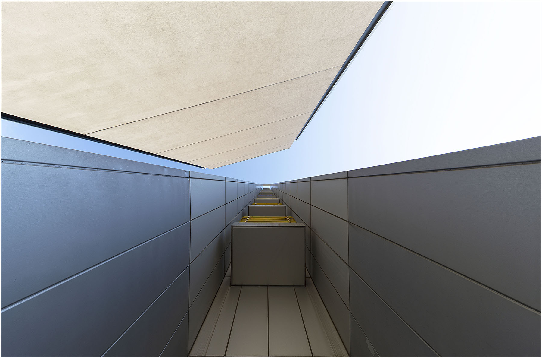 | Un ottimo gioco formale, con un notevole punto di fuga ,nella parte inferiore. Ci si aspetta che la parte in alto prosegua verso lo stesso punto di fuga, ma la sua brusca interruzione, oltre a rendere particolare il tutto, , esalta l' accuratezza prospettica in basso. Notevole, complimenti |