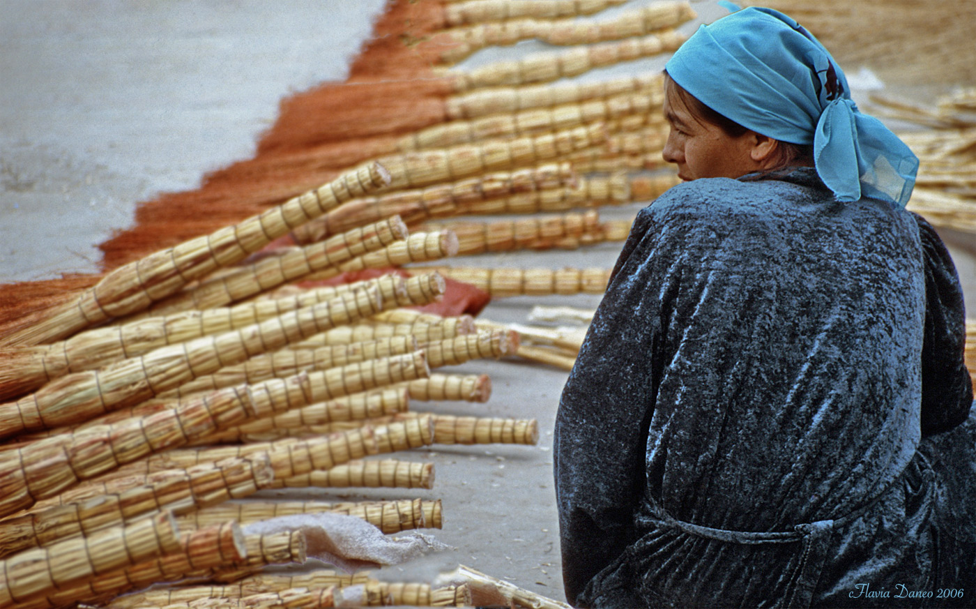 Splendido lo stacco tra l'azzurro elettrico della venditrice sui toni ocra rossi delle scope.