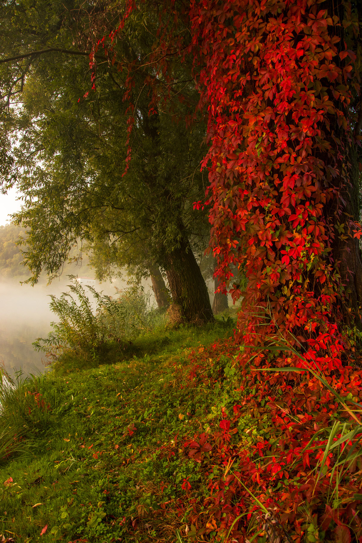 Come una cascata di foglioline in rosso sulla quinta del primo piano che riesce a restare in sintonia con lo sfondo arboreo del lago fumoso di nebbie mattutine nonostante la forza del suo colore acceso. Un'immagine dal sapore romantico ben vista, pensata e realizzata. Ciao, Tiziano  |