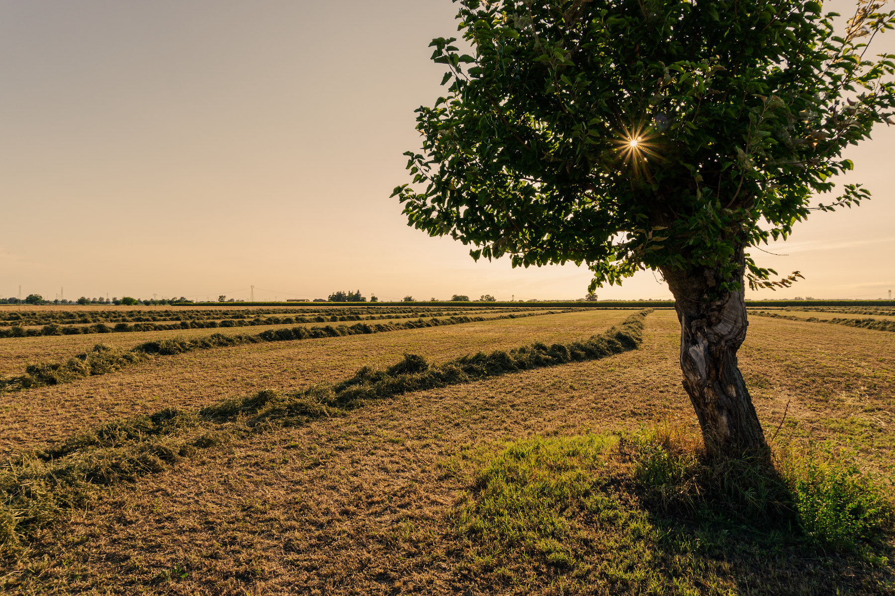 Bello il gioco di linee dell'erba tagliata che convergono verso il tronco.