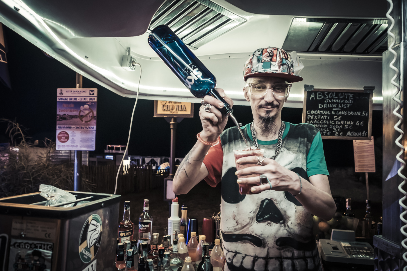Hai beccato un personaggio ed ambientazione che piu' caratteristici di cosi' non si poteva. Gran composizione, con la particolare postura del barman (che da solo,giustamente, risolve gran parte della foto),fantastico il contorno da bar estivo supeincasinato lungo mare,luce che neanche a farlo apposta bacia perfettamente gli elementi presenti. Bella PP,con quel filtro che non so cosa sia ma calza a pennello con il contesto. Ottima.