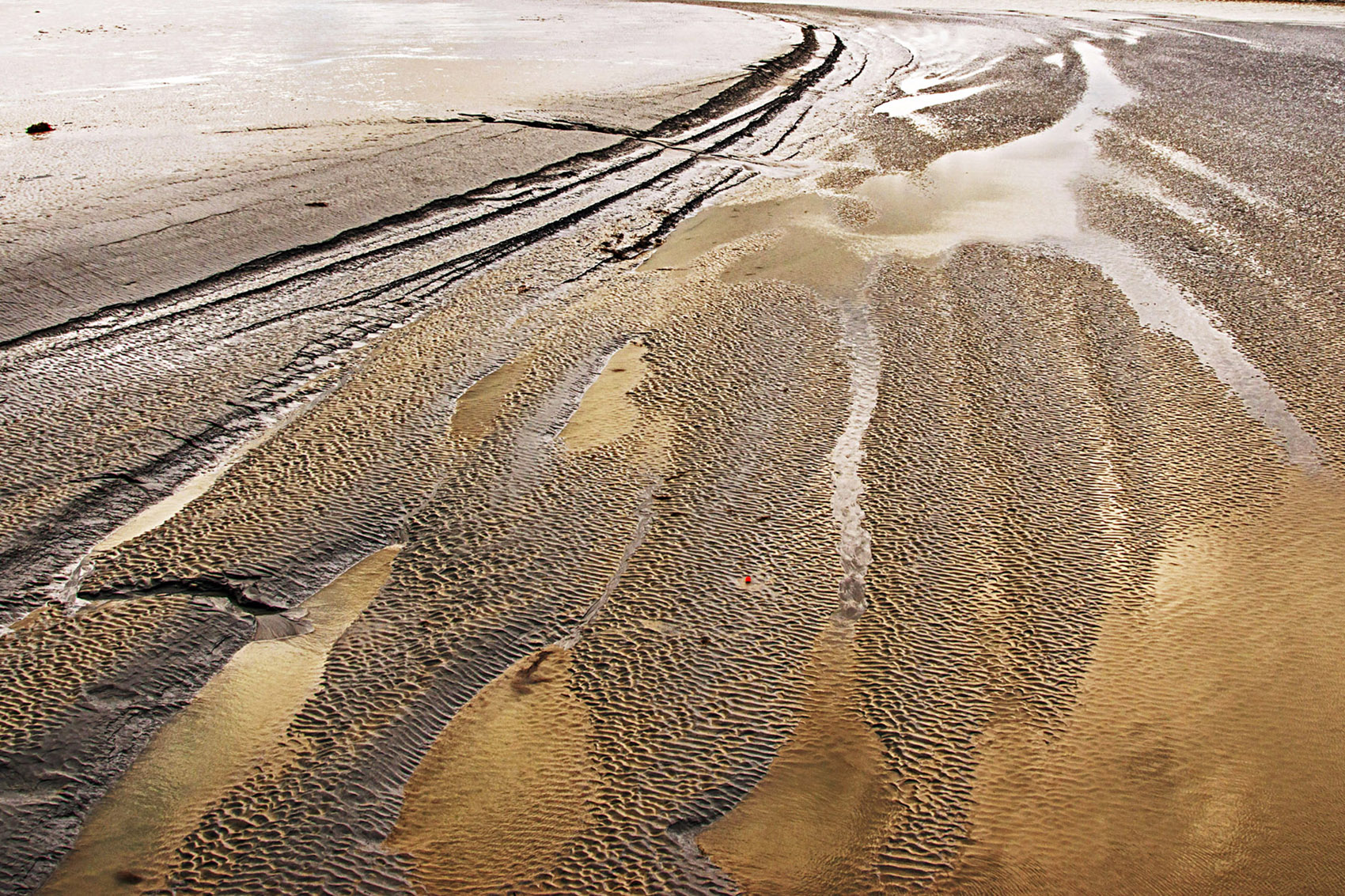 Bello ed ipnotico il motivo impresso sulla sabbia bagnata ed i colori della stessa mentre asciuga ,in accompagnamento alle pozze d'acqua dorata. Un po' tanta "chiarezza" per rimarcare il pattern presente , puo' piacere o meno son gusti personali. Piacevole scatto.