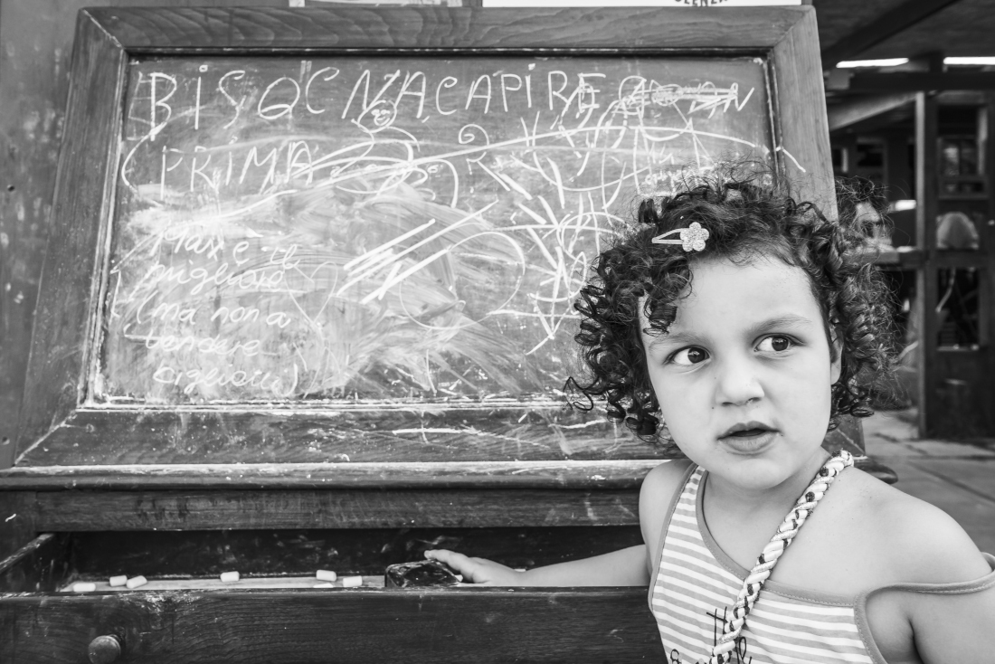 | Probabilmente stufa di quanto scrivono gli adulti, cercando con i loro insegnamenti, basati sul “bisogna capire”, di inglobarla in una didattica che lascia poco spazio alla libera creatività, ha riempito la lavagna con scritte non vincolate a nessun tipo di didattica.....ma, dalla sua espressione, sembra essersi accorta della presenza del docente. Per evitare punizioni, cerca di cancellare quello che, per gli adulti, non ha senso. Una espressione eloquente in una immagine che trovo molto bella e significativa |